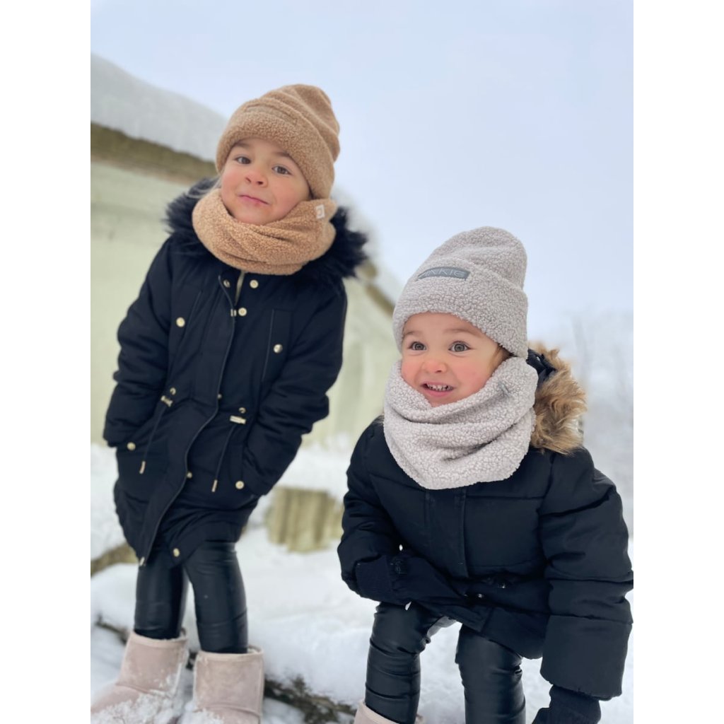 Měkoučká čepice z medvídkového úpletu zdobená koženkovým štítkem.