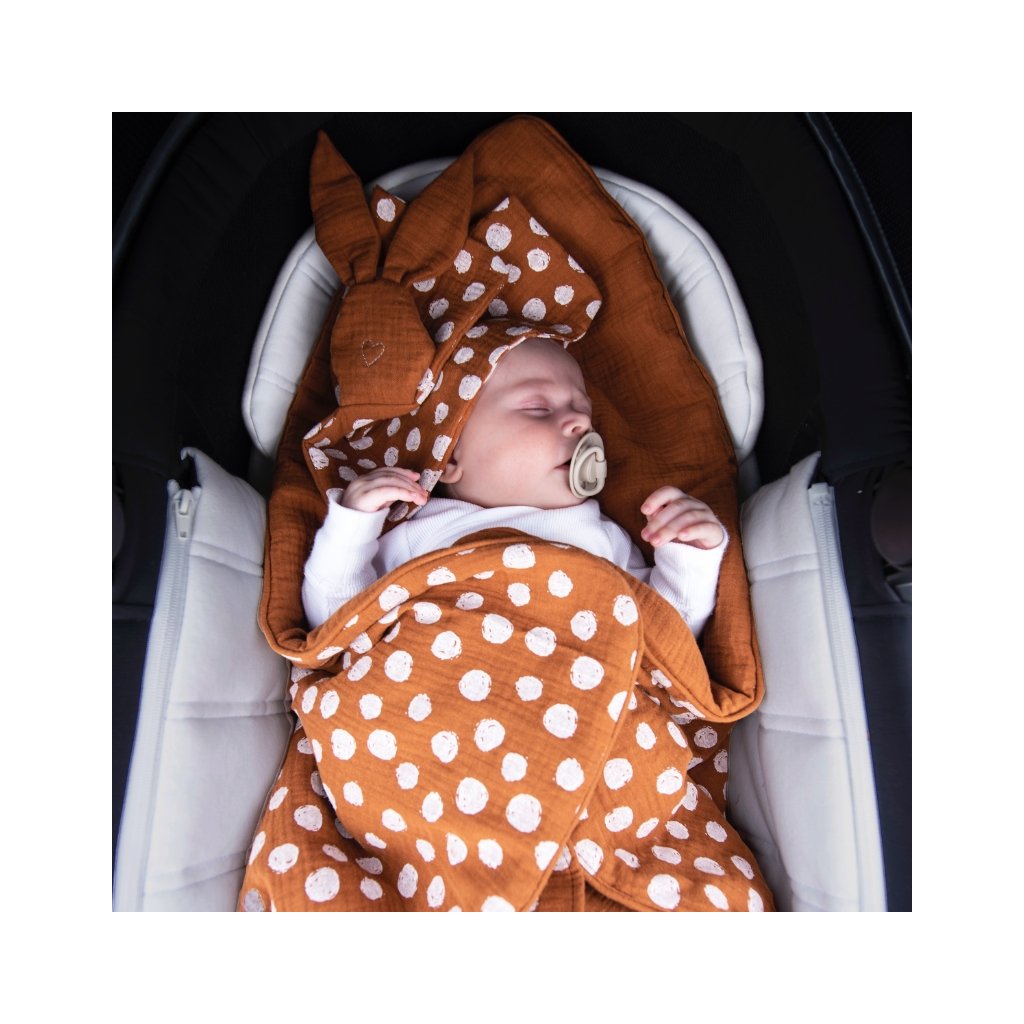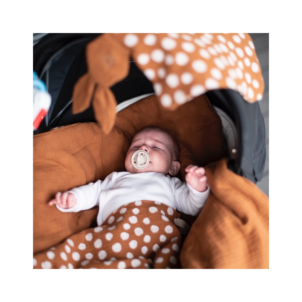 Az alvókendő 100 % biopamut muszlinból készült, amely rendkívül puha, légáteresztő és kíméletes a baba érzékeny bőréhez.
