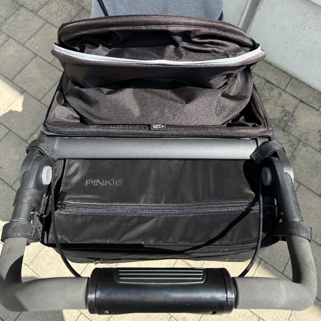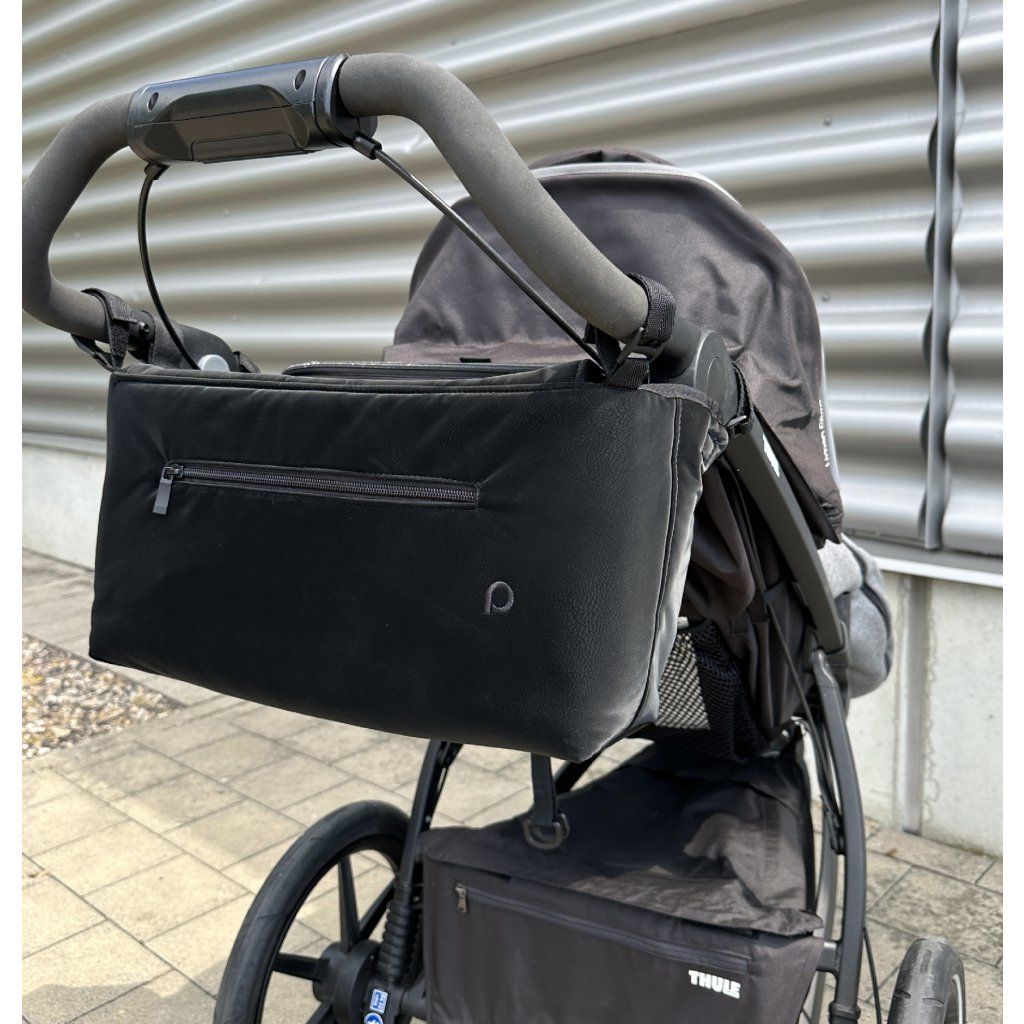Tágas rendezőtáska Thule vagy hasonló babakocsihoz. Sajátos tolókarjához terveztünk egy rendezőtáskát, amely tökéletesen illeszkedik és lemásolja a babakocsi formáját. Ezért az ülés fekvő helyzetbe döntése után sincs a táska útban, mert ferde formájú.