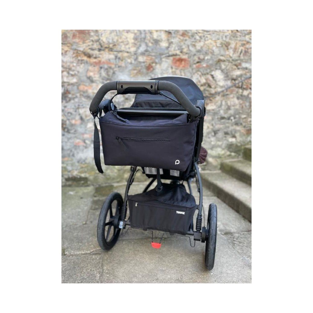 Tágas rendezőtáska Thule vagy hasonló babakocsihoz. Sajátos tolókarjához terveztünk egy rendezőtáskát, amely tökéletesen illeszkedik és lemásolja a babakocsi formáját. Ezért az ülés fekvő helyzetbe döntése után sincs a táska útban, mert ferde formájú.
