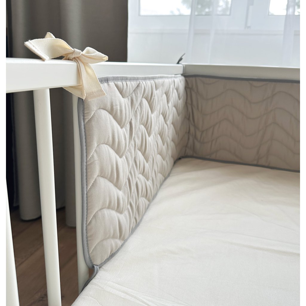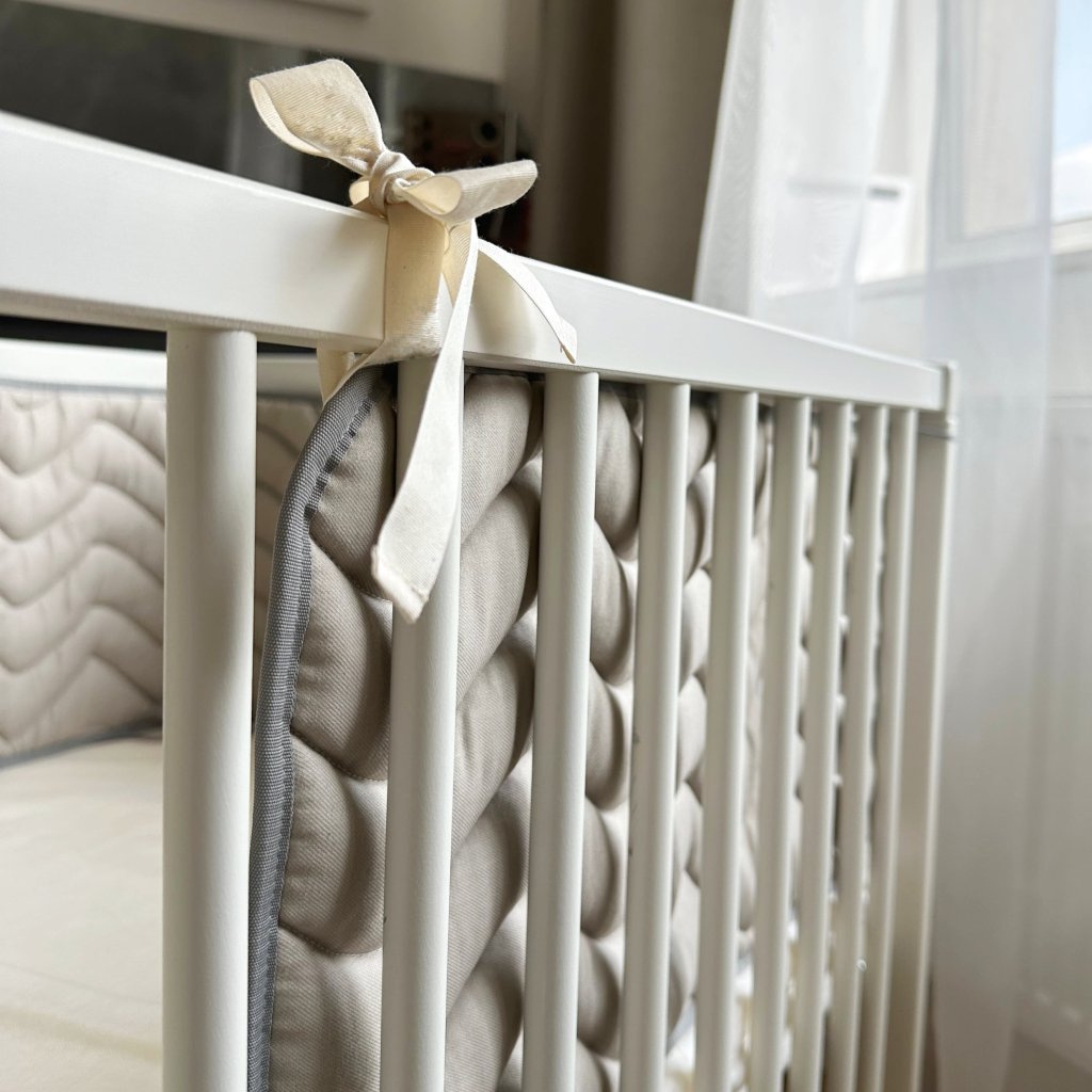 Prošívaný mantinel z BIO bavlny – měkký, bezpečný a šetrný k dětské pokožce. Chrání před nárazy a dotváří útulný prostor v postýlce.