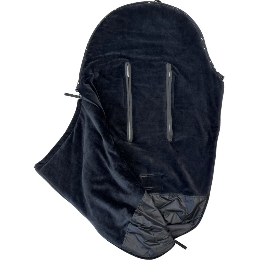 - Posiada sznureczek ściągający chroniący główkę przez zimnem i wiatrem a także sznureczek do przymocowania śpiworka do wózka by nie zjeżdżał.