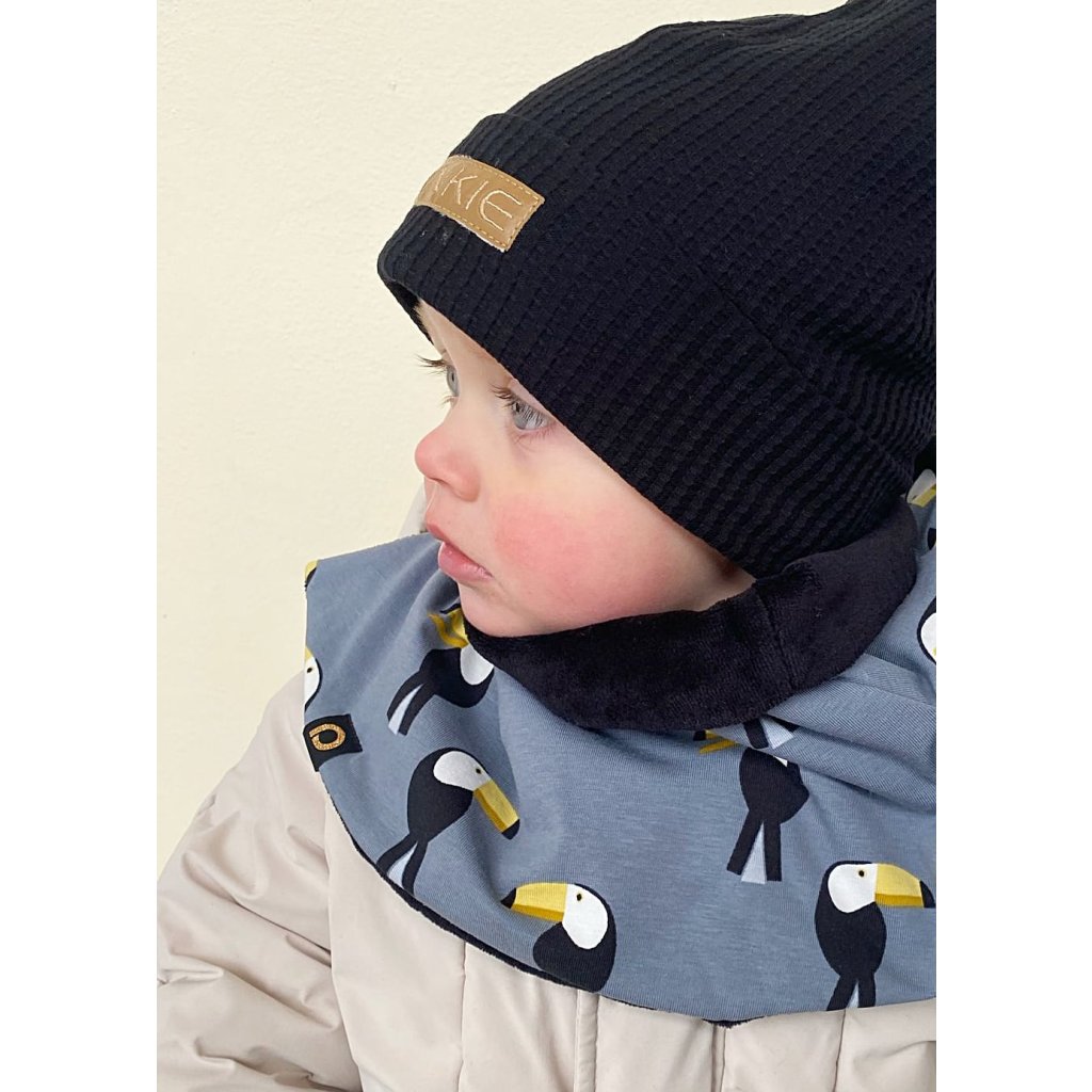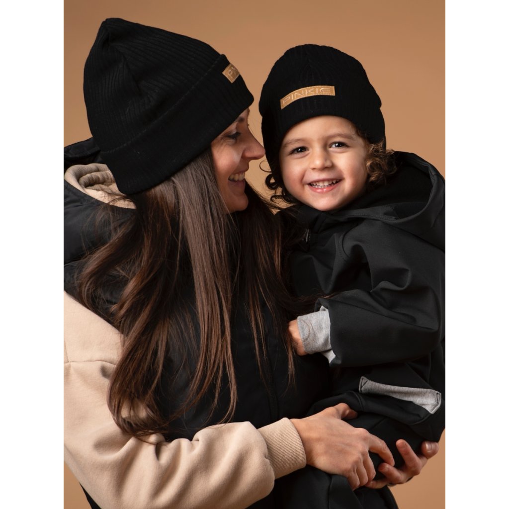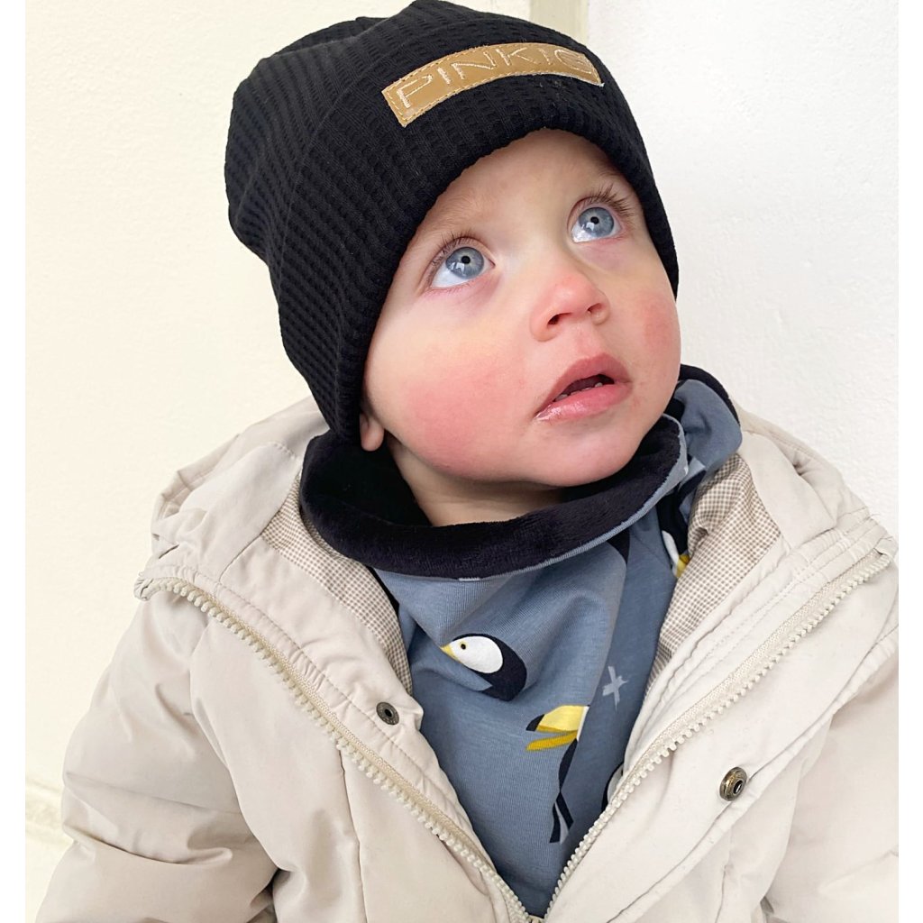 Modna czapka z dzianiny prążkowanej ozdobiona skórzanną metką.